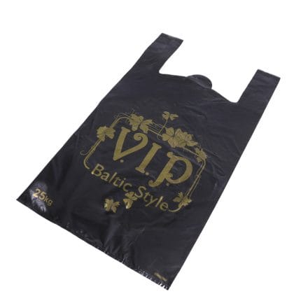 Bags with handles 350+160x600mm, 25µm, black with "VIP2" print, HDPE, in packs of 100.