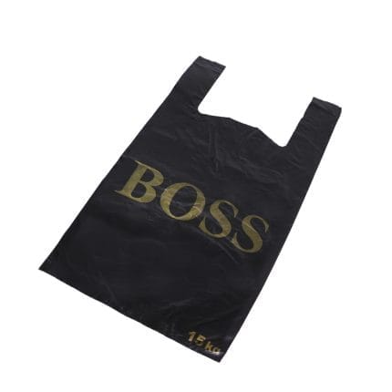 Bags with handles 300+180x550mm, 20µm, black with "BOSS" print, HDPE, in packs of 100.