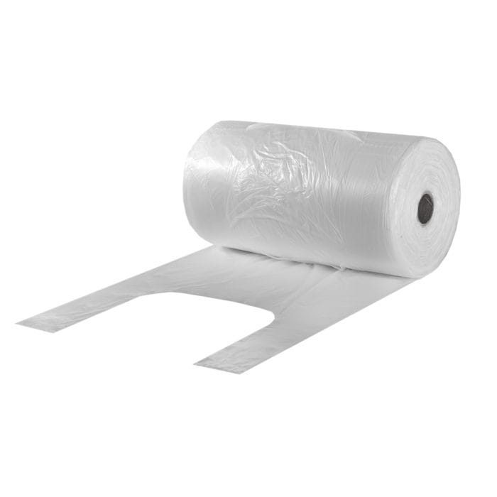 Bags with handles 21+11x45cm, 9µm, transparent, HDPE, in rolls of 500 pcs.