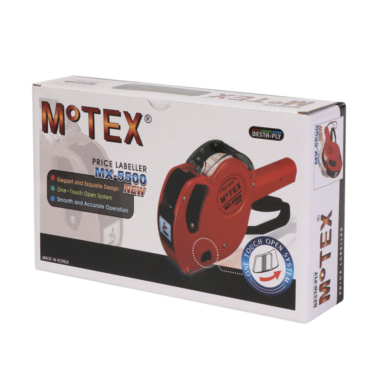 MX 5500 marking gun, single line, 8 characters, suitable for 21.5×12 mm labels, with protective cover for labels. Specific currency symbols – Ls, Kr, Lt, $, EUR.