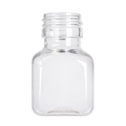Buteliukai PET (30 % rPET), 50 ml, kaklelio Ø28 mm, skaidrūs, stačiakampio formos, pakuotėje 126 vnt.