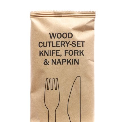 Medžio pl. stalo įrankių rinkinys – šakutė, peilis, servetėlė, supakuoti individualiai