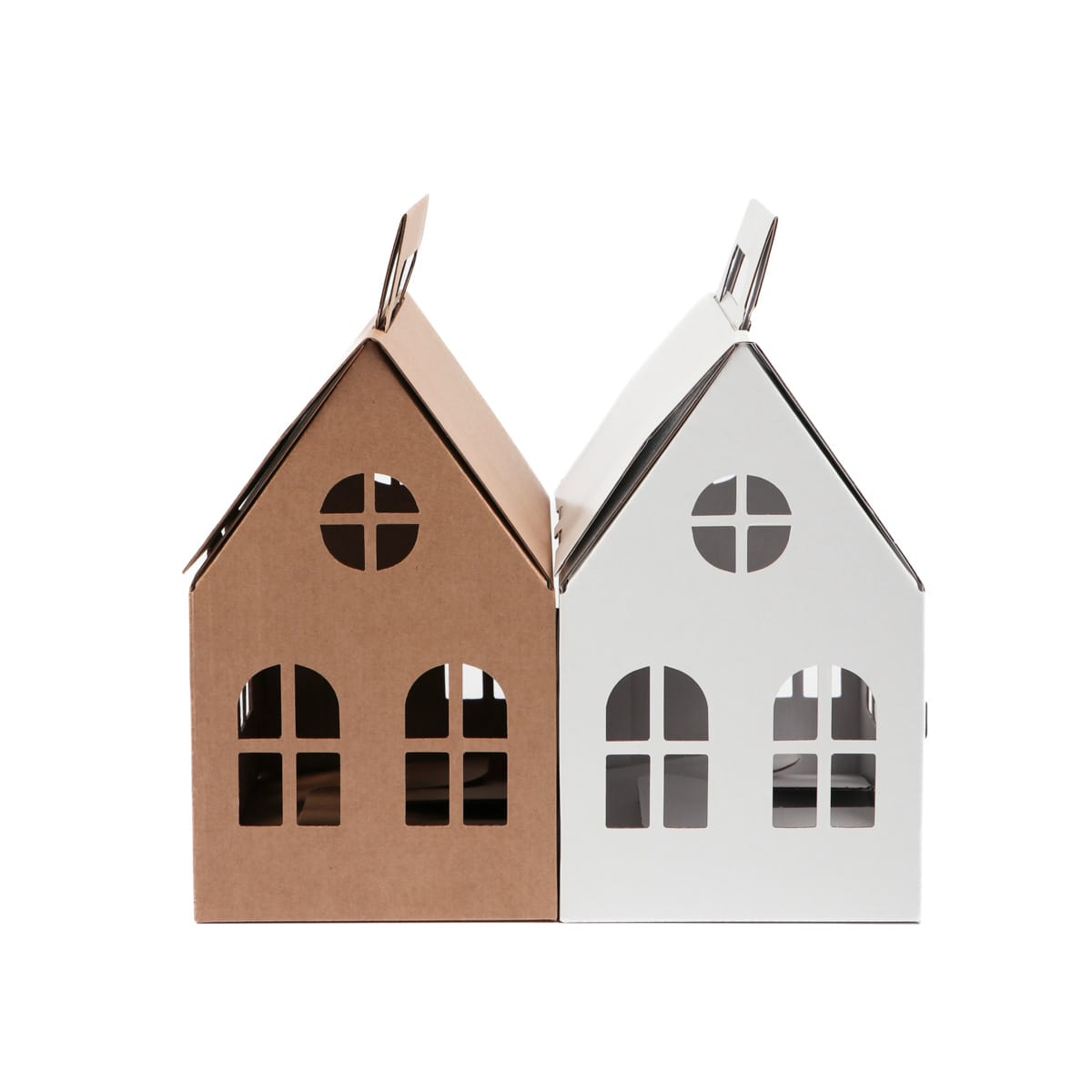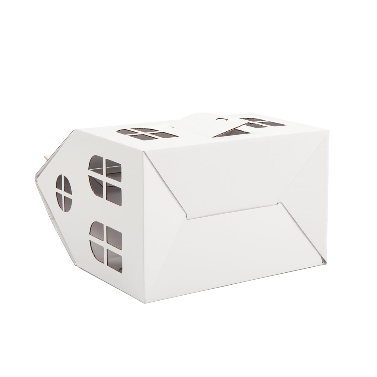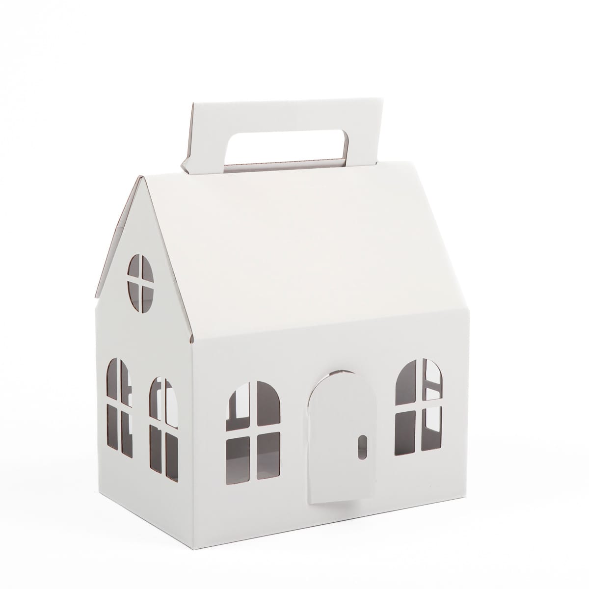 Dovanų dėžutė iš mikro gofruoto kartono „Kalėdų namelis”. Dovanų pakavimo variantas, kurio viduje galima sudėti saldainius, dovanas, girliandas (numatyta vieta baterijų skyriui).