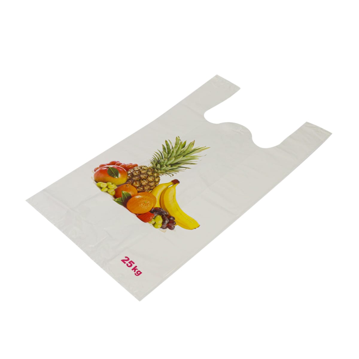 Maišeliai su rankenėlėmis 380+180x640mm, 50µm, baltos sp., su spauda Vaisiai, HDPE, pakuotėje 25 vnt.