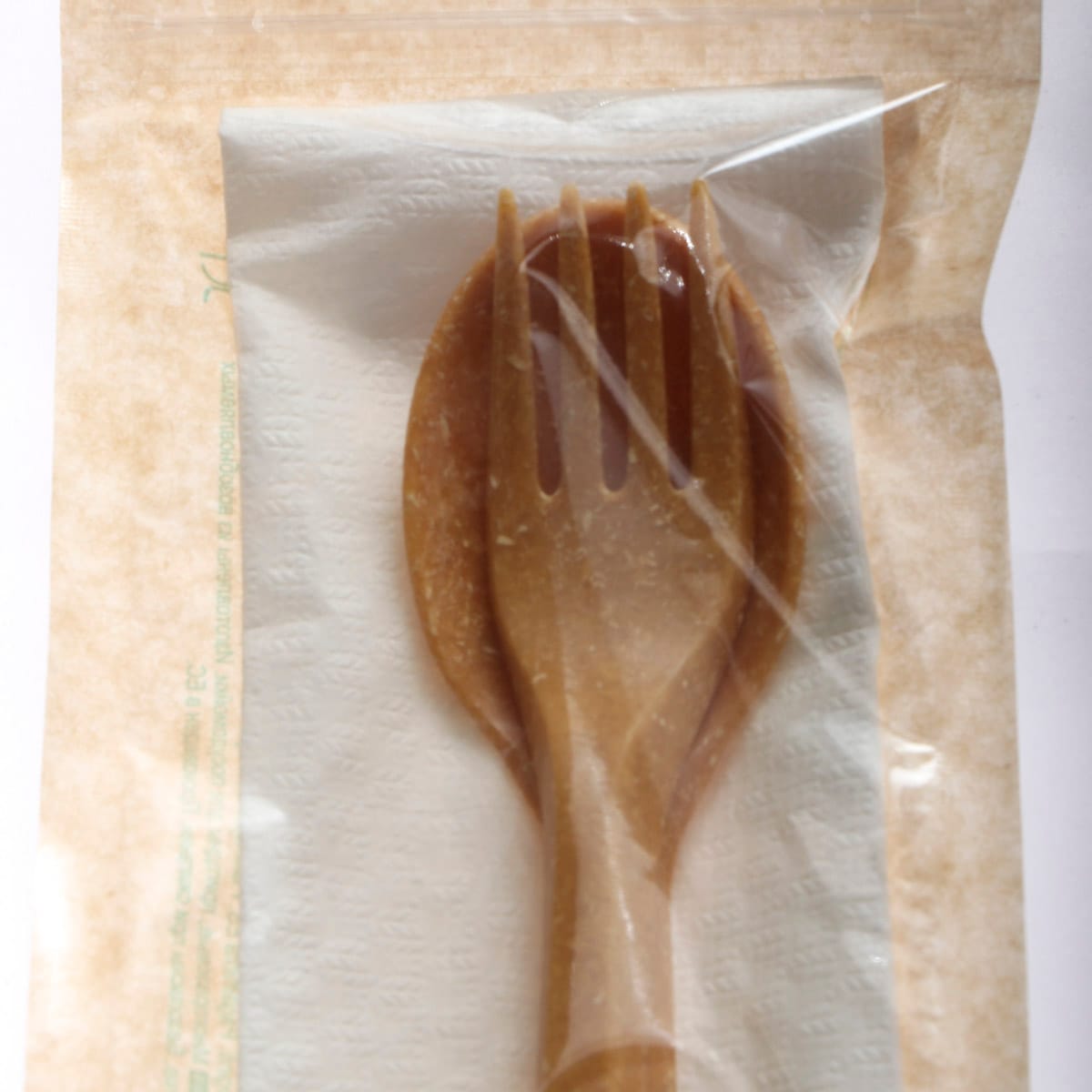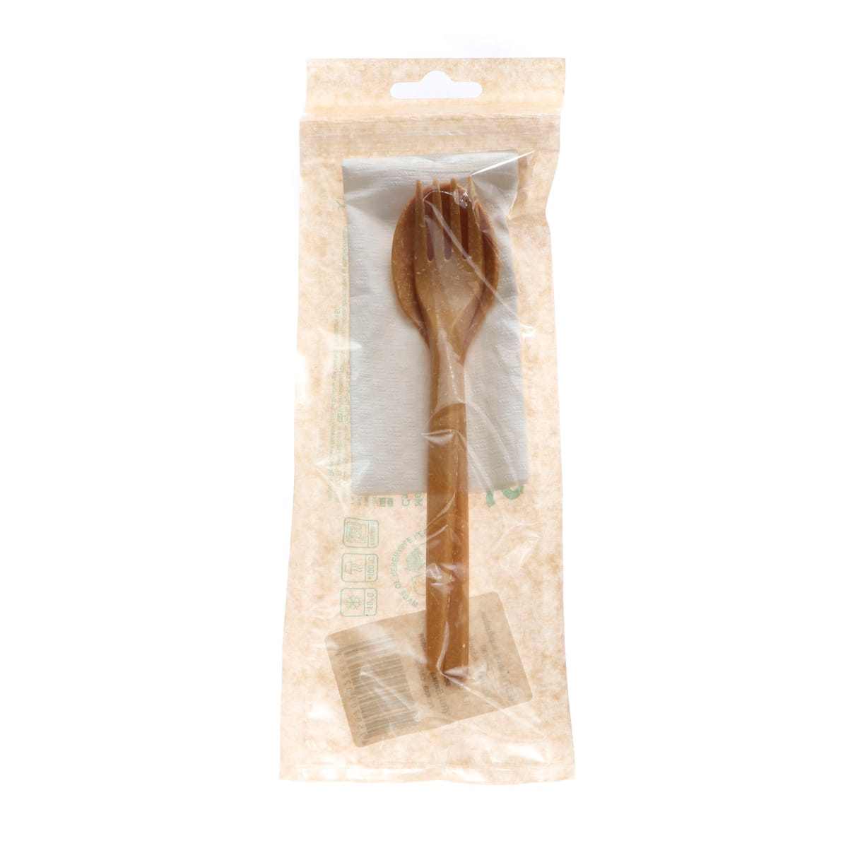 SPINO BIO medžio pl. stalo įrankių rinkinys – šakutė, šaukštas ir servetėlė, supakuotas individualiai