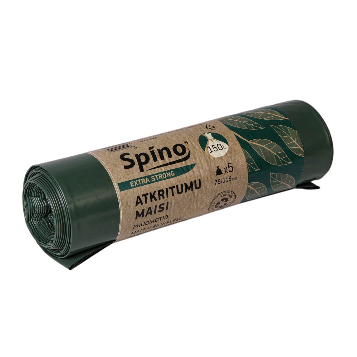 Atkritumu maisi Spino, 150L, 75x115cm, 60µm, zaļi-melni, LDPE, rullī 5gab.