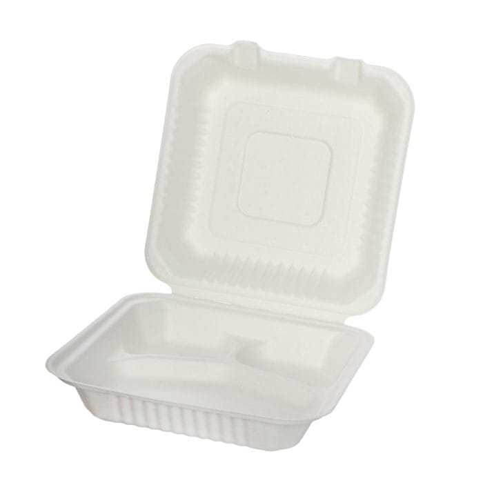 Konteineri trīsdaļīgi ar atlokāmu vāku BIOBOX, cukurniedru, 263x230x70mm, balti, iepakojumā 50gab.