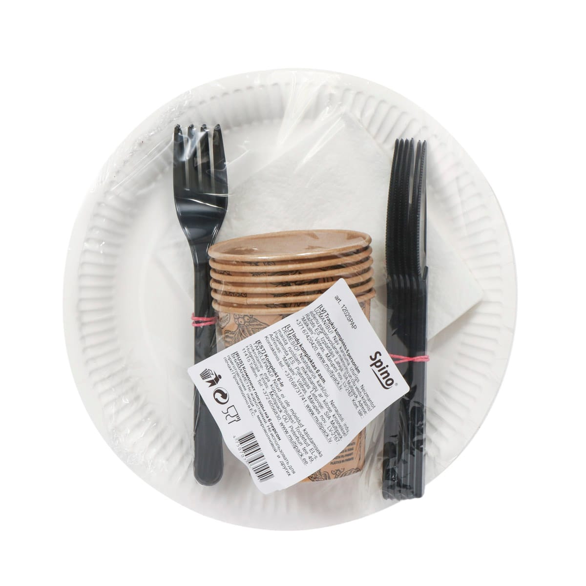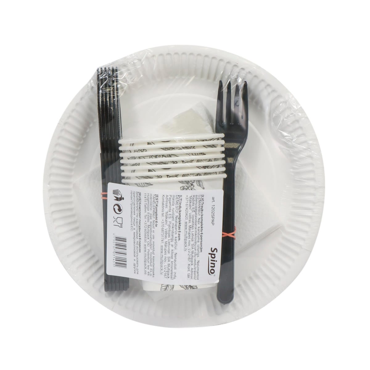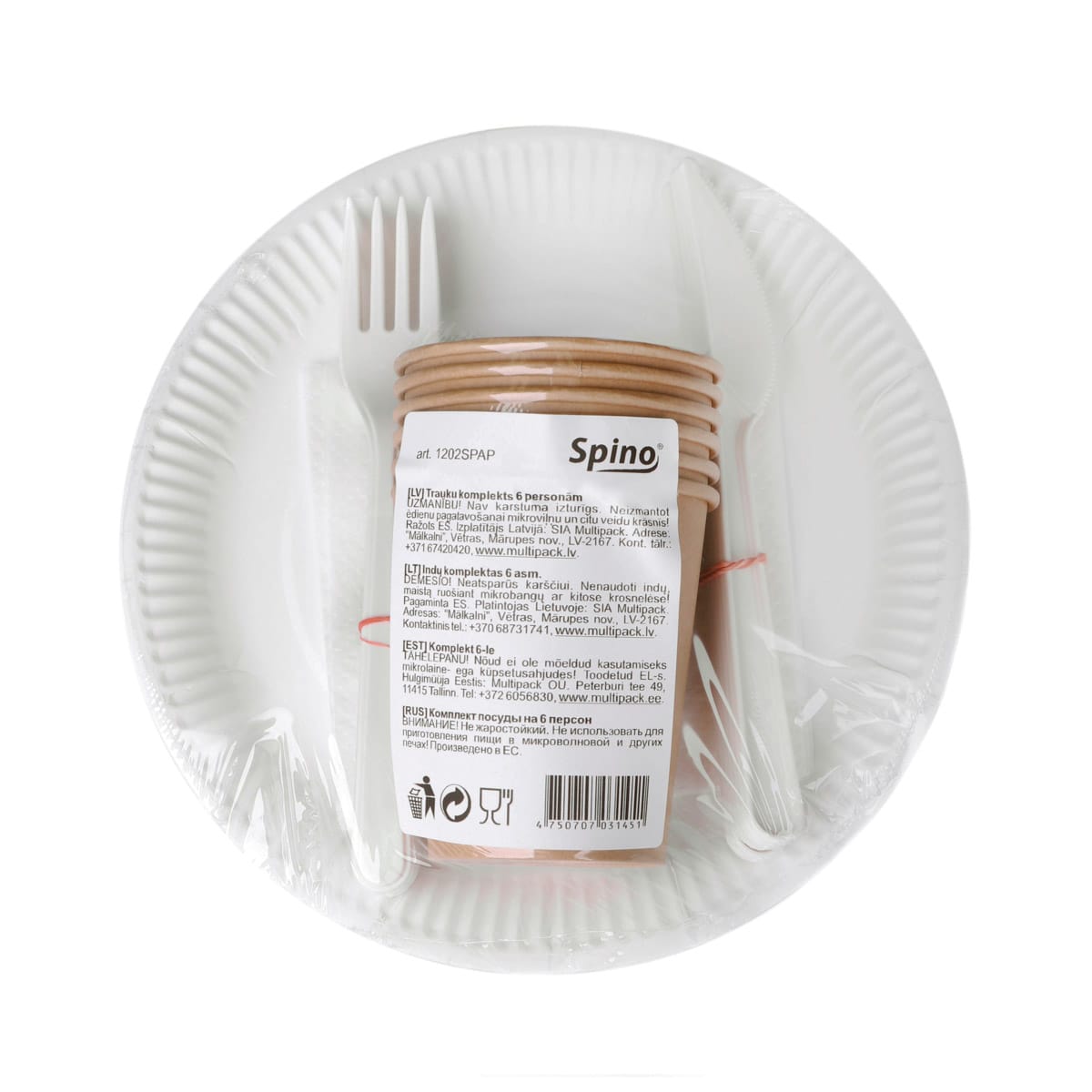 Vienreizlietojamo trauku komplekts Spino 6 personām. Komplektā ietilpst – 6 papīra 250ml glāzes, 6 papīra šķīvji Ø23cm, daudzreiz lietojami plastmasas galda piederumi – 6 naži, 6 dakšas, un 6 salvetes. Paredzēti aukstiem un karstiem produktiem.