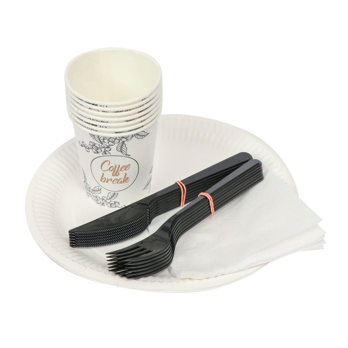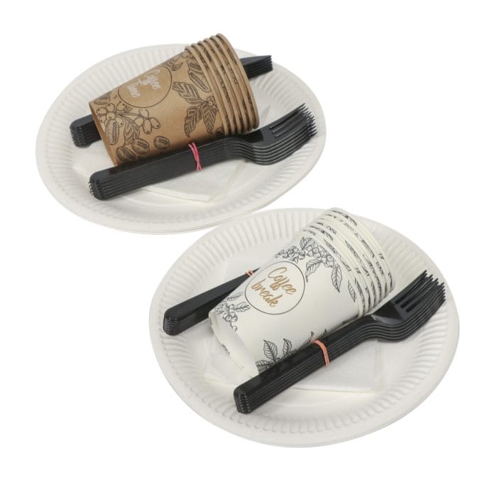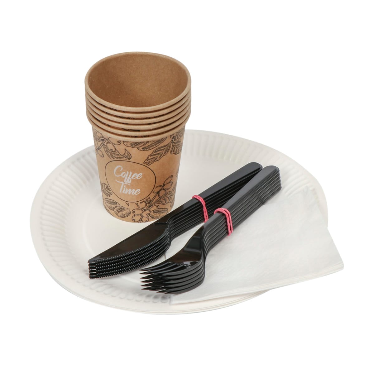Vienreizlietojamo trauku komplekts Spino 6 personām. Komplektā ietilpst – 6 papīra 250ml glāzes, 6 papīra šķīvji Ø23cm, daudzreiz lietojami plastmasas galda piederumi – 6 naži, 6 dakšas, un 6 salvetes. Paredzēti aukstiem un karstiem produktiem.